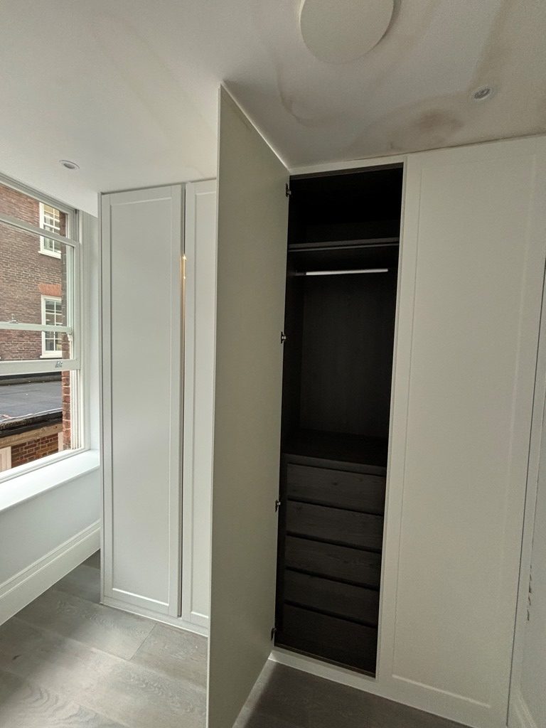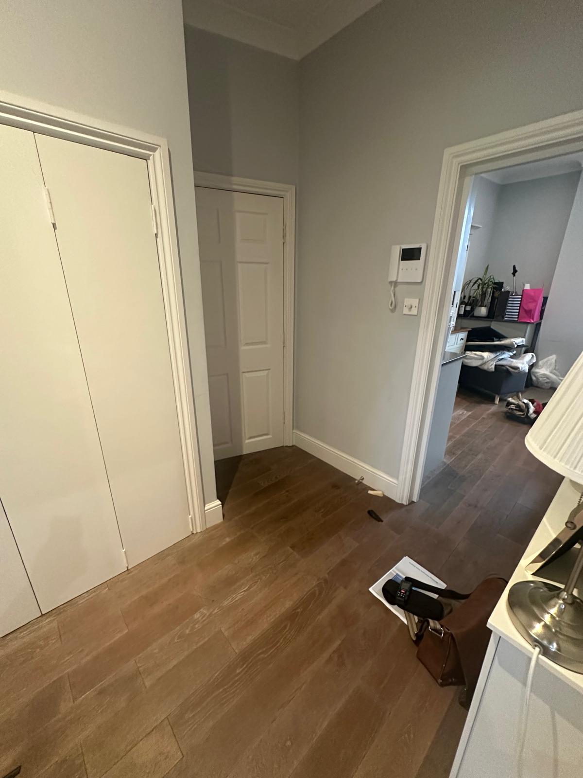 A high-end apartment in Kensington suffered significant water damage when a connector pipe in the toilet failed overnight. Water spread across the ceiling and onto the hardwood flooring in the open-plan living area, damaging built-in cabinetry, skirting boards, and causing damp staining on adjoining walls.
