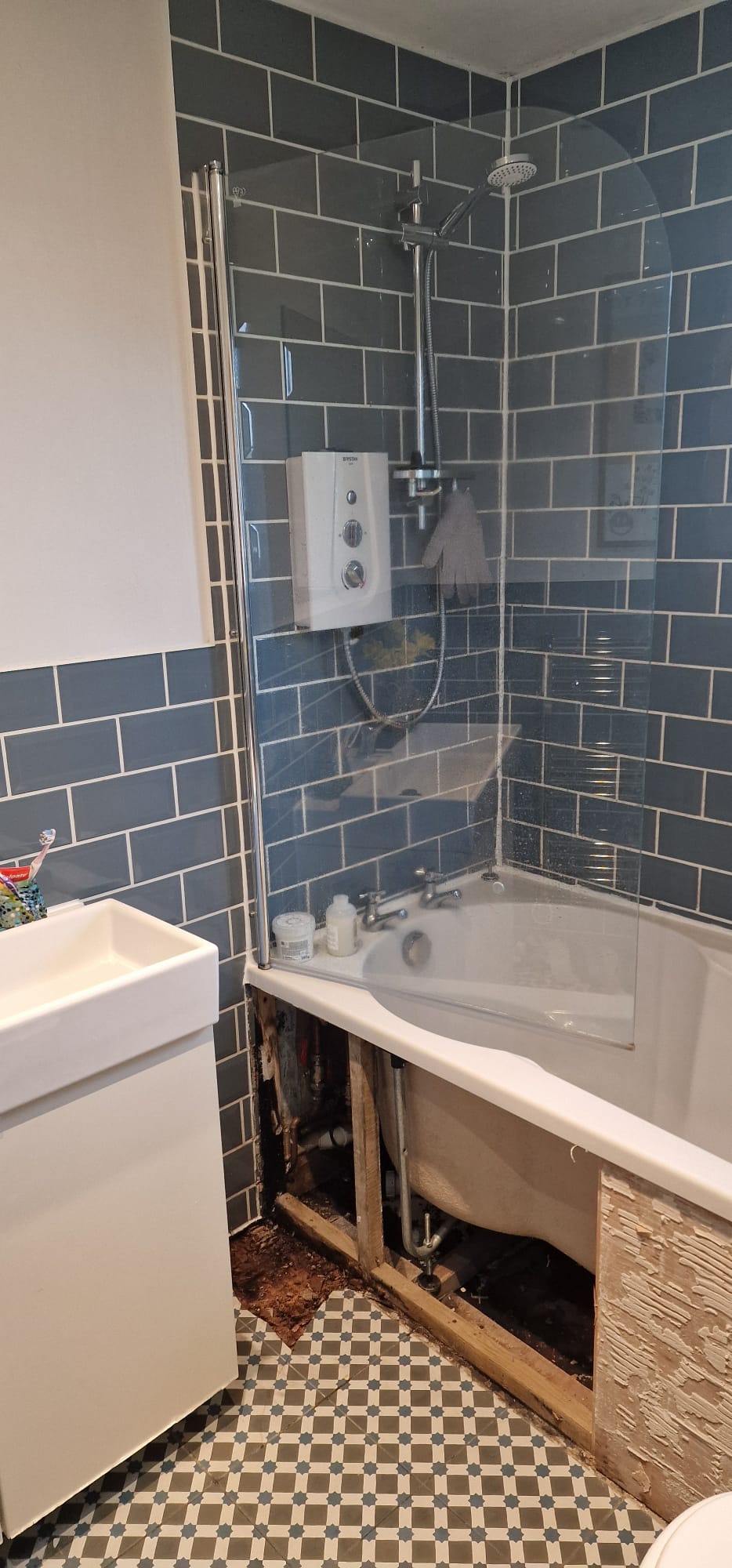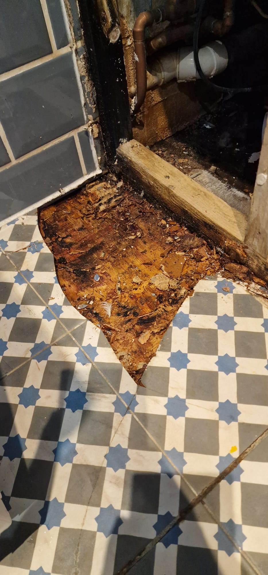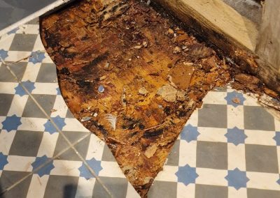 We quickly connected our client with a leak detection specialist. We explained that if she paid for the leak detection service, we could recover the cost under her policy’s trace and access cover. The specialist discovered the leak under the bathtub of the flat above, hidden behind a tiled bath panel. To access it, the tiles had to be removed, revealing a soaking wet subfloor. As both flats were under the same block insurance policy, we negotiated the claim for both properties. We also began the drying process while waiting for approval.