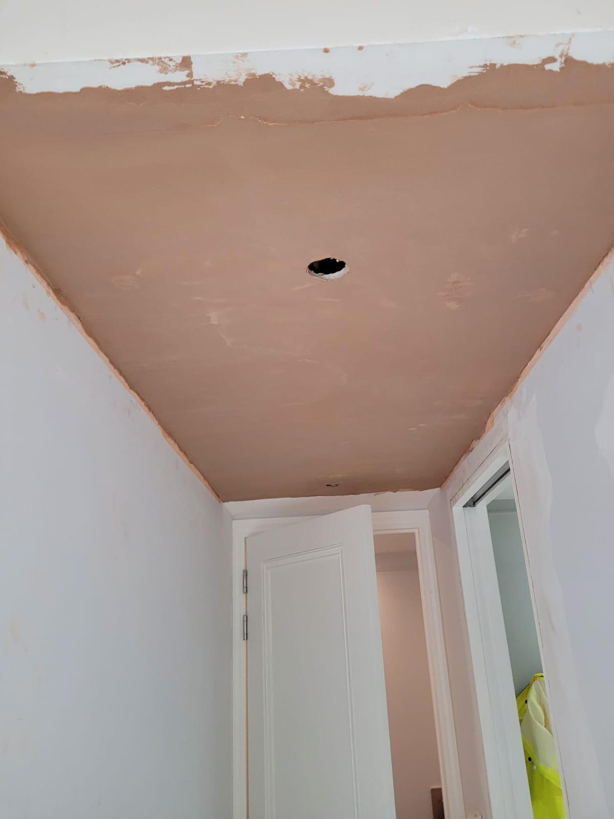 Our client returned home one day to find water dripping down from his ceilings and walls. The upstairs neighbour was cooperative and immediately arranged for a plumber, who traced the leak to a communal soil stack running through the void between the flats.